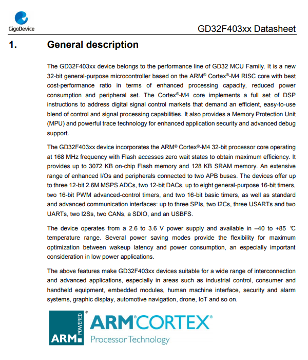 The GD32F403xx device belongs to the performance line of GD32 MCU Family. It is a new 32-bit general-purpose microcontroller based on the ARM® Cortex®-M4 RISC core with best cost-performance ratio in terms of enhanced processing capacity, reduced power consumption and peripheral set. The Cortex®-M4 core implements a full set of DSP instructions to address digital signal control markets that demand an efficient, easy-to-use blend of control and signal processing capabilities. It also provides a Memory Protection Unit (MPU) and powerful trace technology for enhanced application security and advanced debug support.