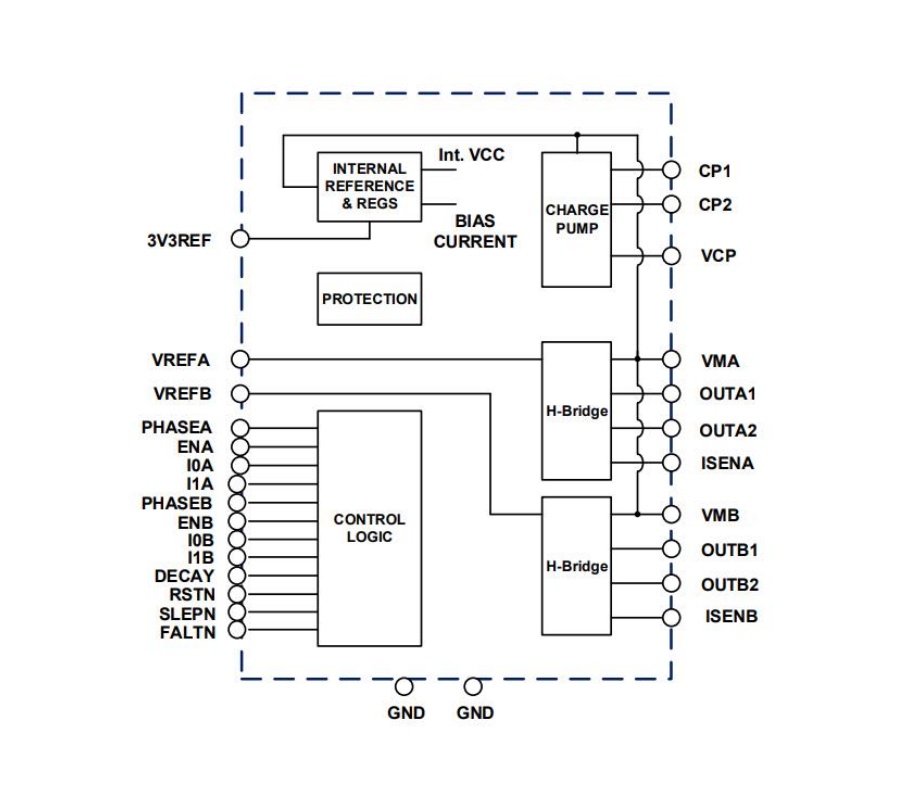 An EN-PH type parallel logic control interface can beconfiguring the output switches ON-OFF of H-bridge,and motor current decay mode is also programming bythe parallel input port.