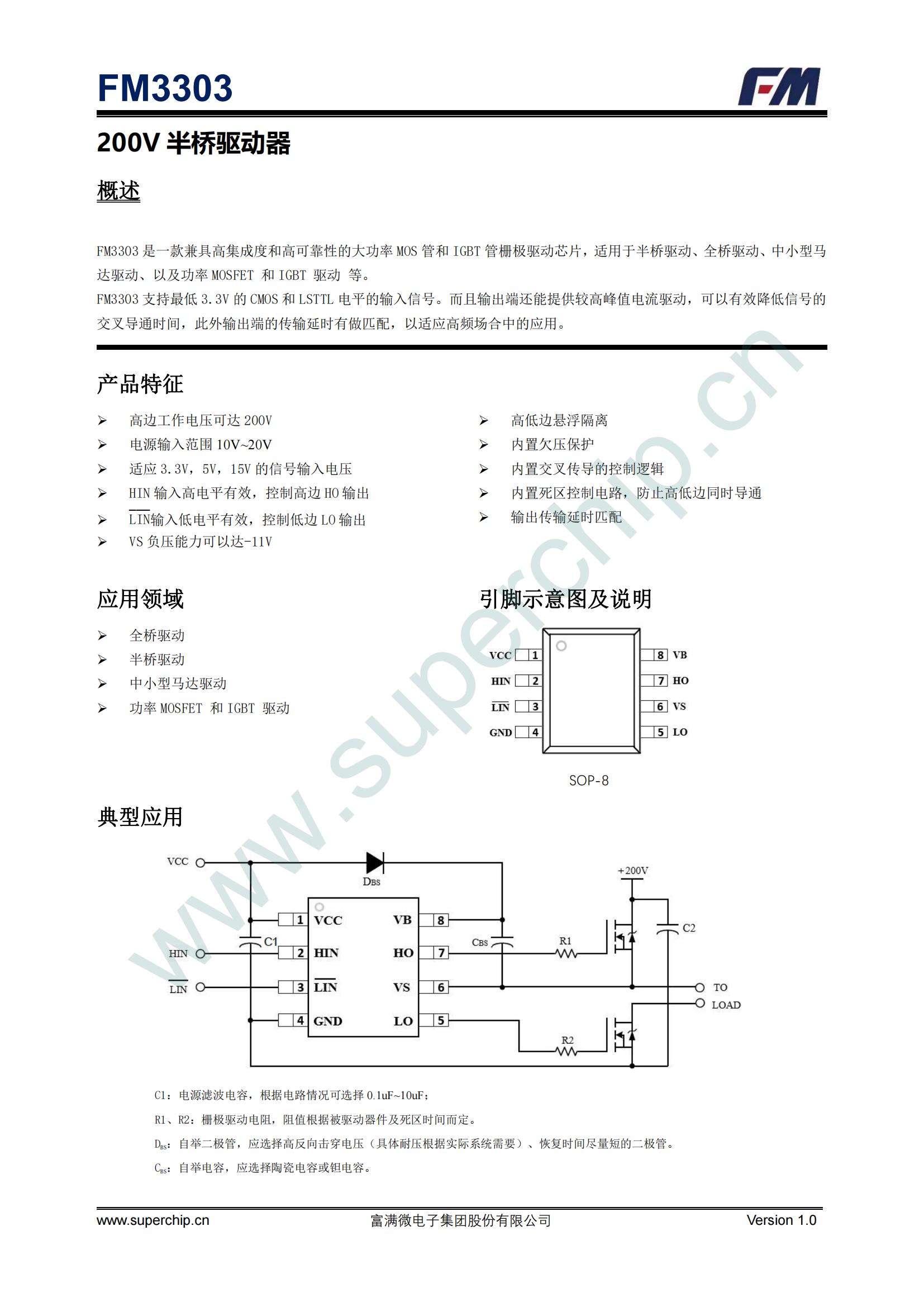 FM3303是一款兼具高集成度和高可靠性的大功率MOS管和IGBT管栅极驱动芯片,适用于半桥驱动、全桥驱动、中小型马达驱动、以及功率MOSFET和IGBT驱动等。