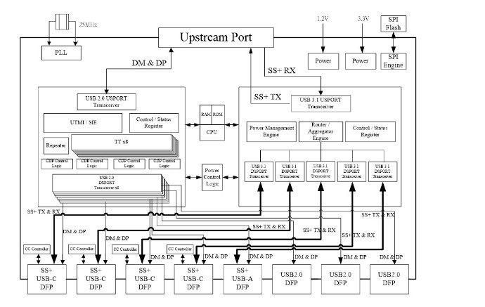 上行端口支持SuperSpeed+ (10G/SS+)、SuperSpeed (5G/SS)、HighSpeed (HS)和FullSpeed (FS)流量