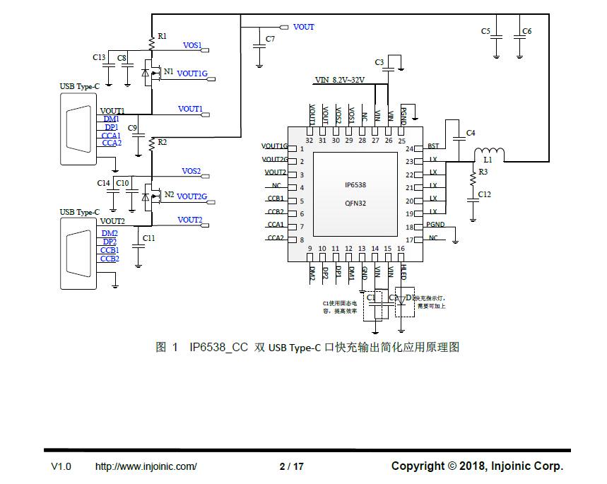 IP6538是一款集成同步开关的降压转换器、支持14种输出快充协议、支持Type-C输出和USBPD2.0/PD3.0(PPS)协议的双口输出soC IC,为车载充电器、快充适配器、智能排插提供完整的解决方案。