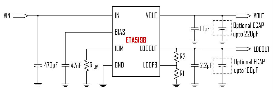 ETA5198是一款高耐压,低噪声,高PSRR的PMU,集成了输出可调的线性稳压器和接口短路保护器。ETA5198工作输入电压30V,输入耐压可达32V。线性稳压器具有200mA的连续电流输出能力并且有限流foldback功能;接口短路保护器具有抑制输入纹波,稳定输出电压功能,并且可以通过外置电阻来设定保护电流。