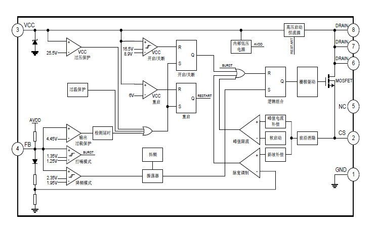 逐周期峰值限流,VCC过压保护(OVP),输出过载保护(OLP)和过温保