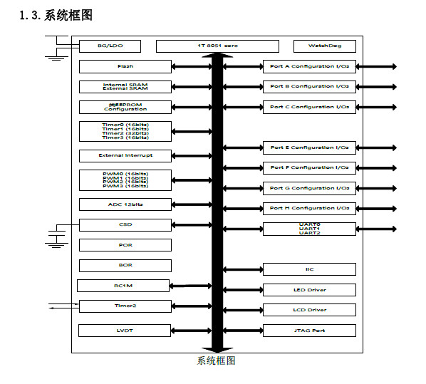 BF7615BMXX-XJXZ采用高速8051内核,1T指令周期,相比于标准的8051(12T)指令周期,具有更快的运行速度,同时兼容标准8051指令。