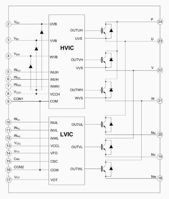 SDM15G60FC8是高度集成、高可靠性的三相无刷直流电机驱动电路,主要应用于较低功率的变频驱动,如空调压缩机、工业伺服器、低功率变频器等。其内置了3相全桥高压栅极驱动电路和6个低损耗IGBT管。