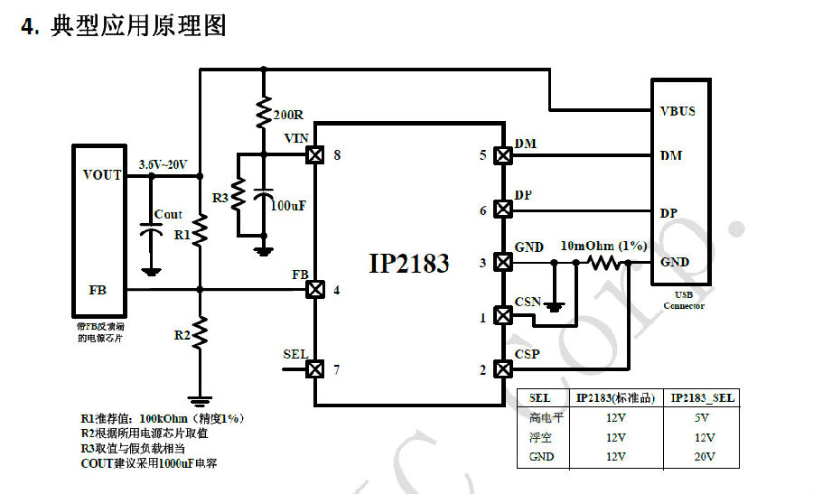IP2183集成FB控制接口,可通过调节FBSOURCE/SINK的电流( zui小2uA/step)来jing确控制输出电压。