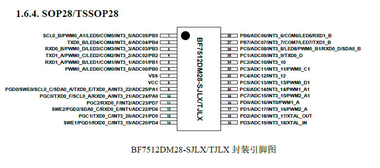 BF7512DMXX-XJLX包含外设有看门..、LED串行点阵驱动、IIC、UART、低电压检测、掉电复位、3路16bit PWM、Timer0、Timer1、Timer2、12bit高jing度逐次逼近ADC、低功耗模式等。