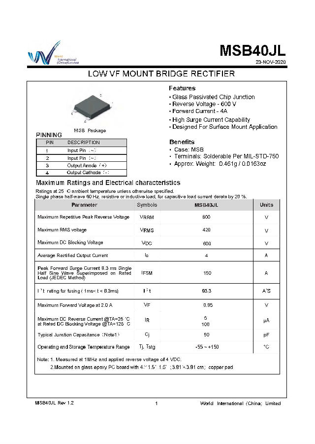 深圳市科瑞芯电子供应 MSB40JL 沃尔德600V4A桥式整流器