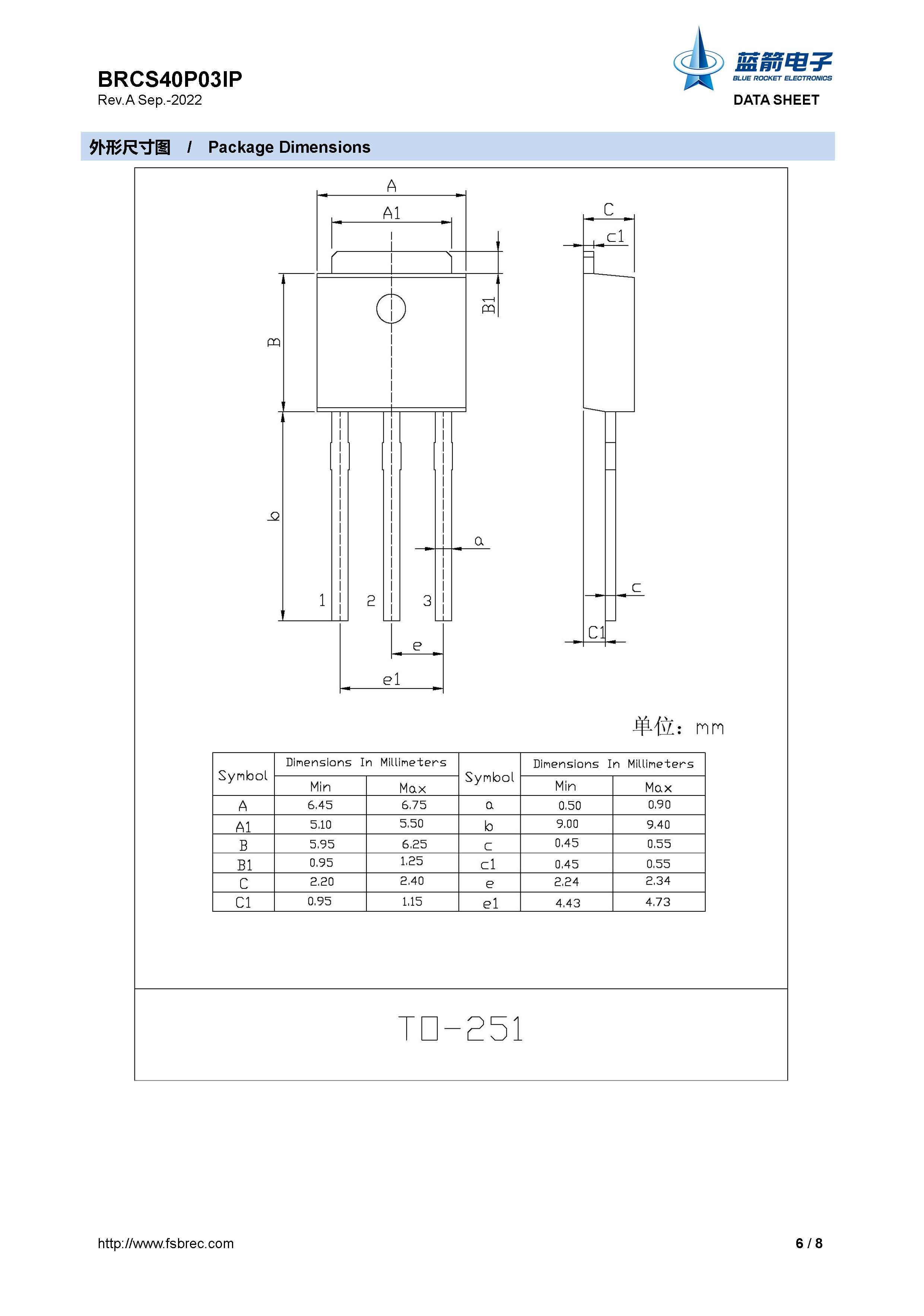 蓝箭P沟道场效应管 BRCS40P03IP TO-251封装