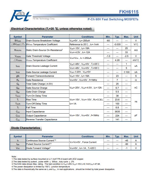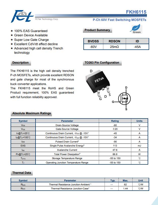 The FKH6115 is the high cell density trenched P-ch MOSFETs, which provide excellent RDSON and gate charge for most of the synchronousbuck converter applications.The FKH6115 meet the RoHS and GreenProduct requirement, 100% EAS guaranteedwith full function reliability approved.