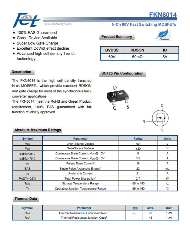 The FKN6014 meet the RoHS and Green Productrequirement, with full function reliability approved.