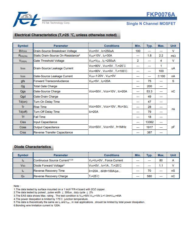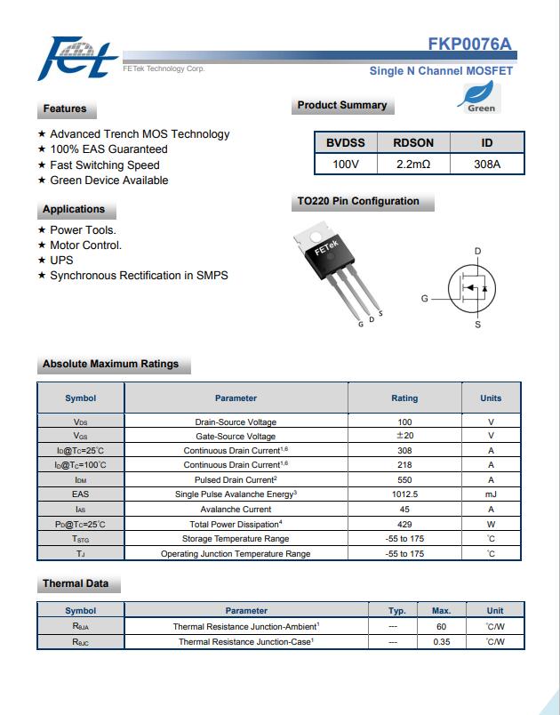 东沅场效应管 FKP0076A 采用沟槽MOS技术