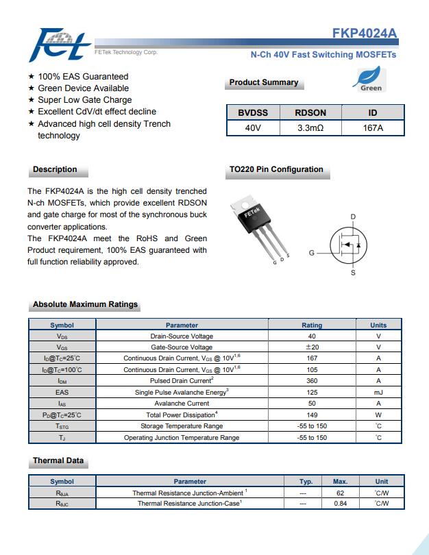 FKP4024A符合RoHS和绿色产品的要求,100%的EAS保证,并通过了全功能可靠性ren证。
