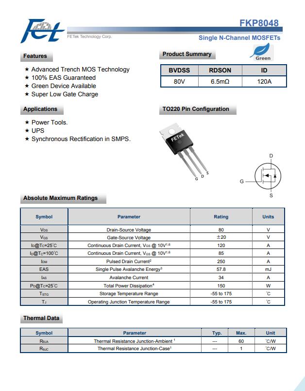 东沅 FKP8048A 80V单N沟道MOSFET