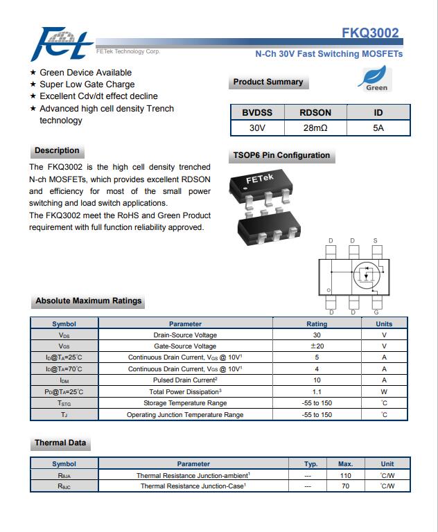The FKQ3002 is the high cell density trenchedN-ch MOSFETs, which provides excellent RDSONand efficiency for most of the small powerswitching and load switch applications.The FKQ3002 meet the RoHS and Green Productrequirement with full function reliability approved.