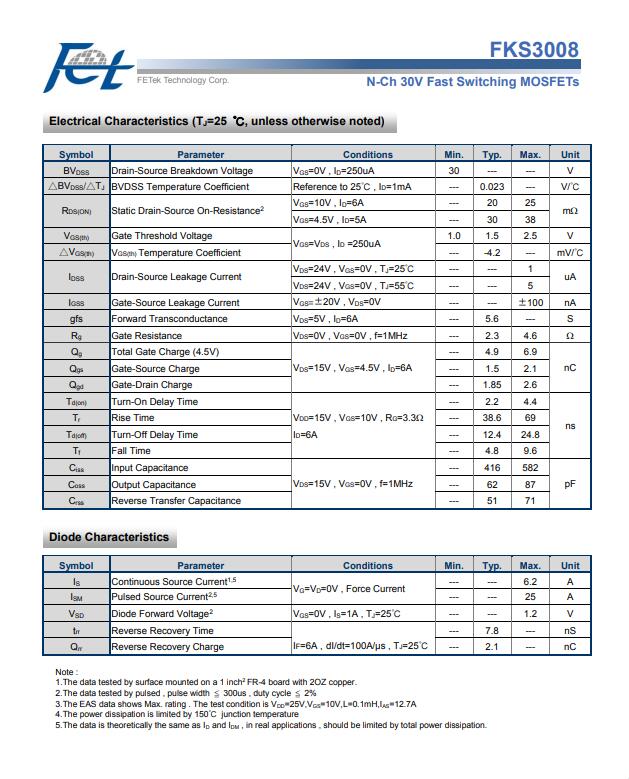 FKS3008是高单元密度沟槽N沟道MOSFET,为大多数同步降压转换器应用提供了出色的RDSON和栅极电荷。