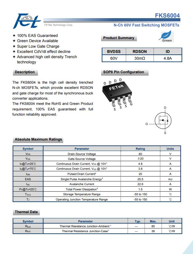 FKS6004是高单元密度沟槽N沟MOSFET,可为大多数同步降压转换器应用提供出色的RDSON和栅极电荷。FKS6004符合RoHS和绿色产品要求,100%EAS保证,全功能可靠性获得批准。