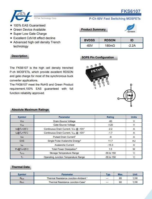 FKS6107是高单元密度沟槽式P-ch MOSFET,可为大多数同步降压转换器应用提供出色的RDSON和栅极电荷。FKS6107符合RoHS和绿色产品要求,100%EAS保证,全功能可靠性获得批准。