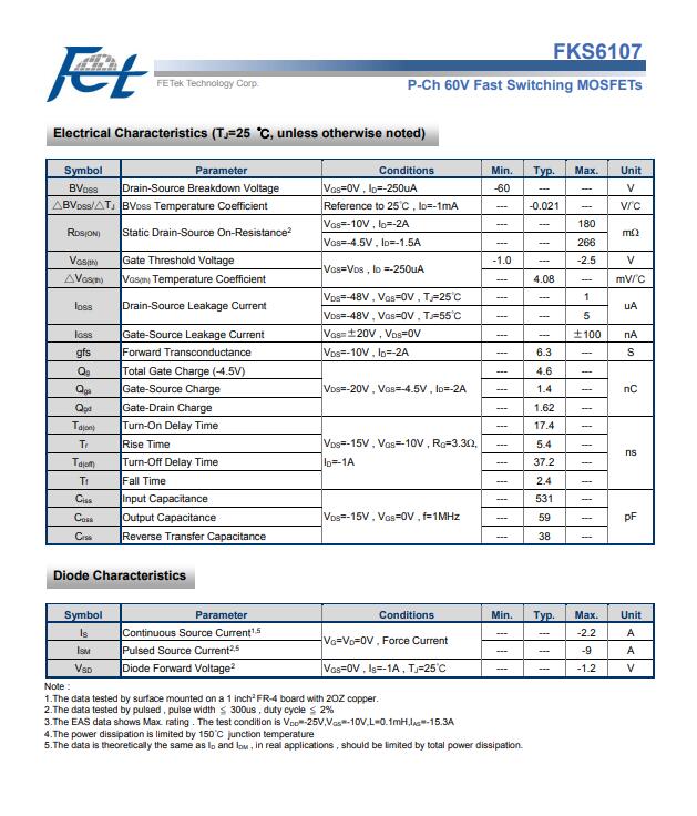 Fet东沅 FKS6107 P沟道MOSFET 原装正品
