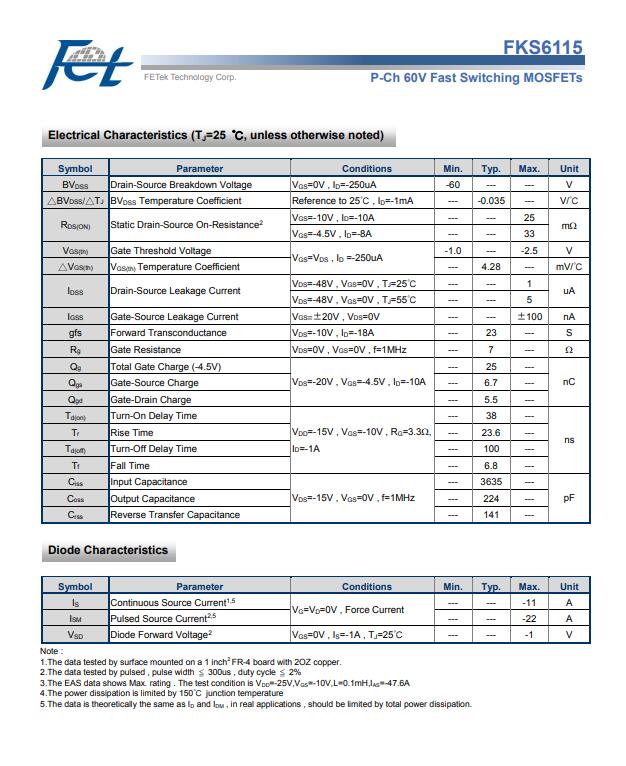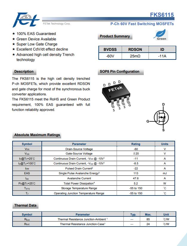 FKS6115是高单元密度沟槽式P-ch MOSFET,可为大多数同步降压转换器应用提供出色的RDSON和栅极电荷。FKS6115符合RoHS和绿色产品要求,100%EAS保证,全功能可靠性获得批准。