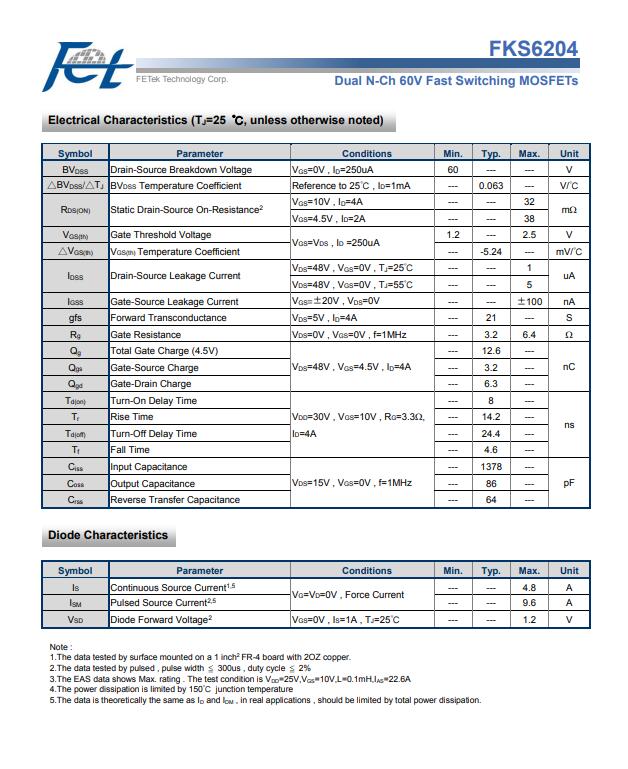The FKS6204 is the high cell density trenched N-ch MOSFETs, which provide excellent RDSON and gate charge for most of the synchronous buckconverter applications.The FKS6204 meet the RoHS and Green Productrequirement, 100% EAS guaranteed with fullfunction reliability approved