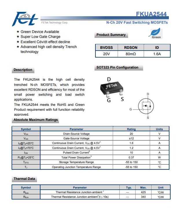 The FKUA2544 is the high cell densitytrenched N-ch MOSFETs, which providesexcellent RDSON and efficiency for most of thesmall power switching and load switchapplications.The FKUA2544 meets the RoHS and GreenProduct requirement with full function reliabilityapproved.
