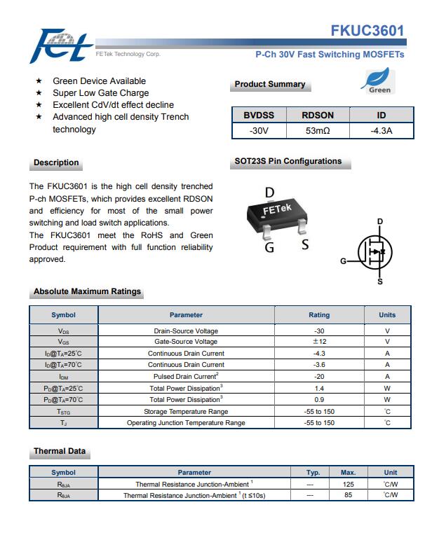 The FKUC3601 is the high cell density trenched P-ch MOSFETs, which provides excellent RDSON and efficiency for most of the small powerswitching and load switch applications.The FKUC3601 meet the RoHS and GreenProduct requirement with full function reliabilityapproved