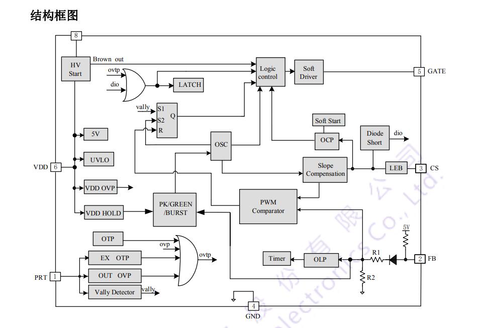 CR5843AS提供了完整的保护功能,包括逐周期过流保护(OCP),过载保护(OLP),外部过温保护以及内部过温保护,输出二极管短路保护,输出过压保护和VDD过压保护。