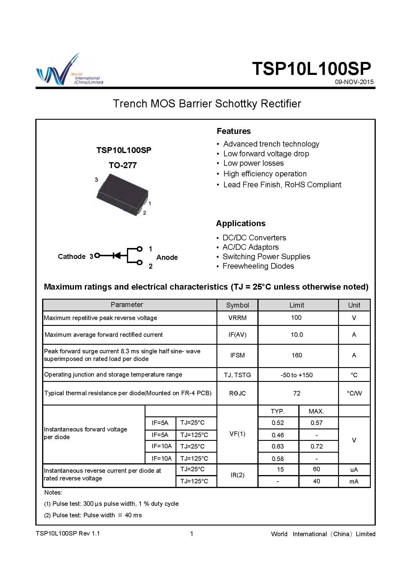 原装供应 TSP10L100SP 沃尔德 低VF肖特基系列