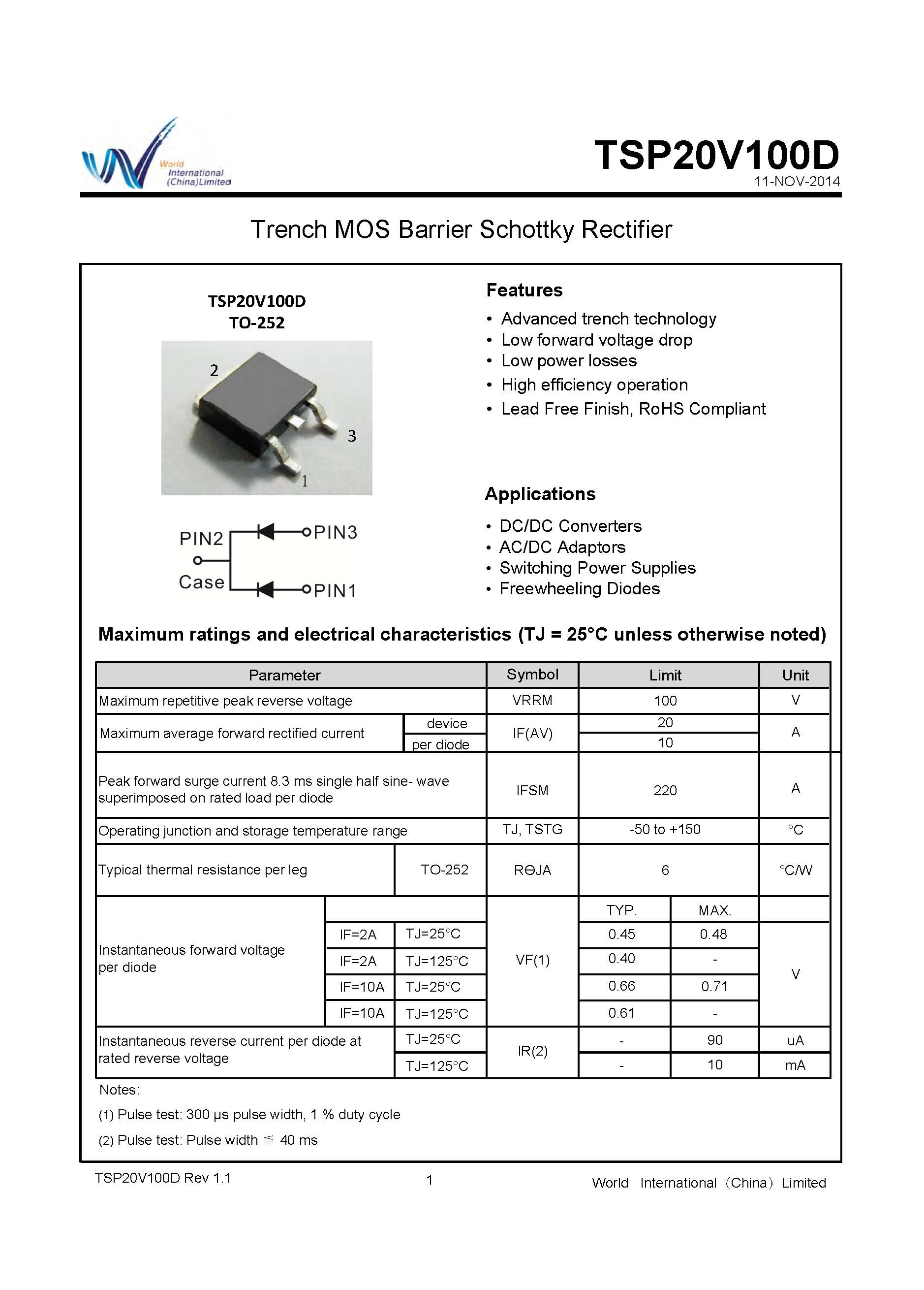 WORLD沃尔德 TSP20V100D 肖特基整流器
