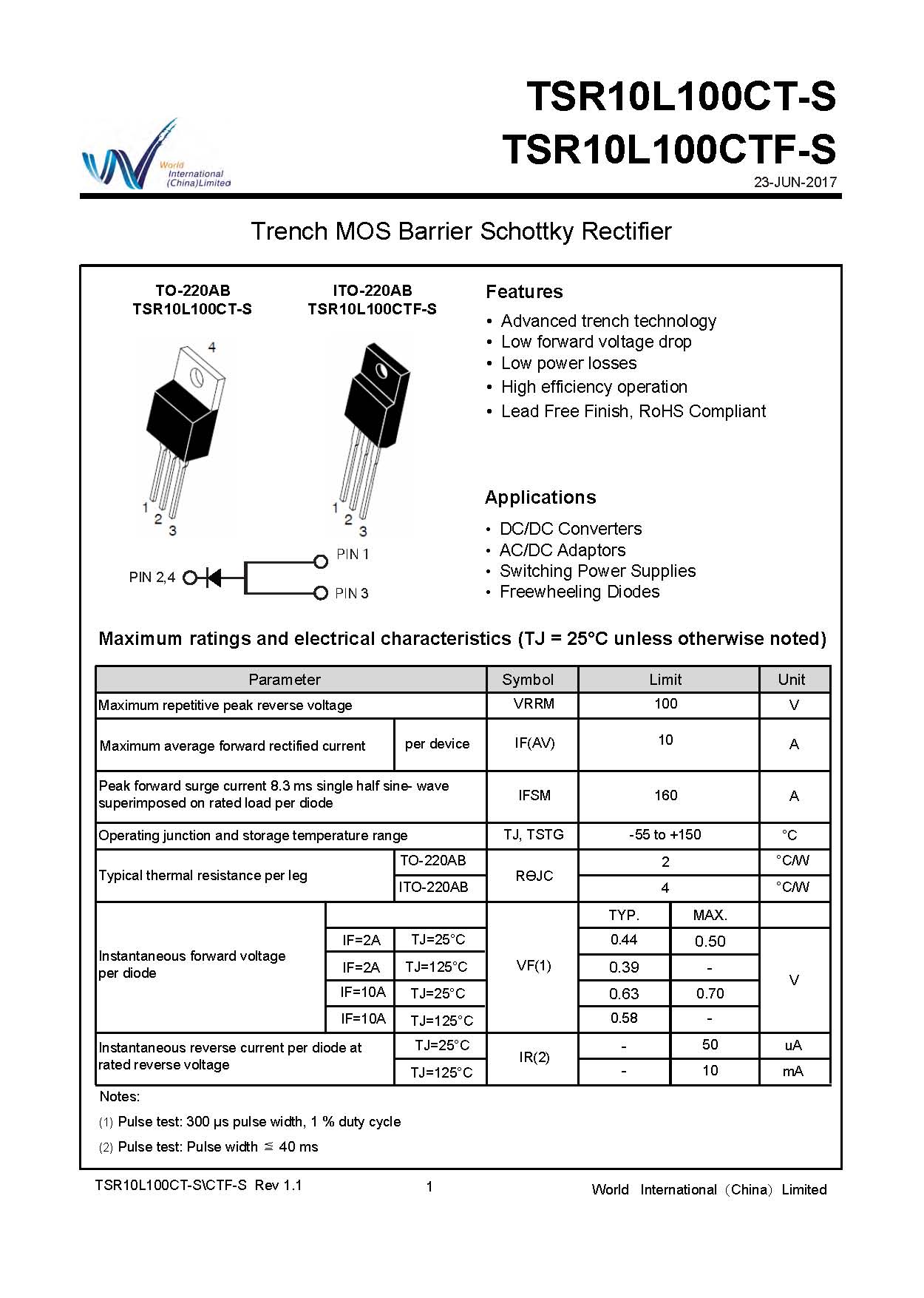 新推出 TSR10L100CT 沃尔德 低VF肖特基整流器