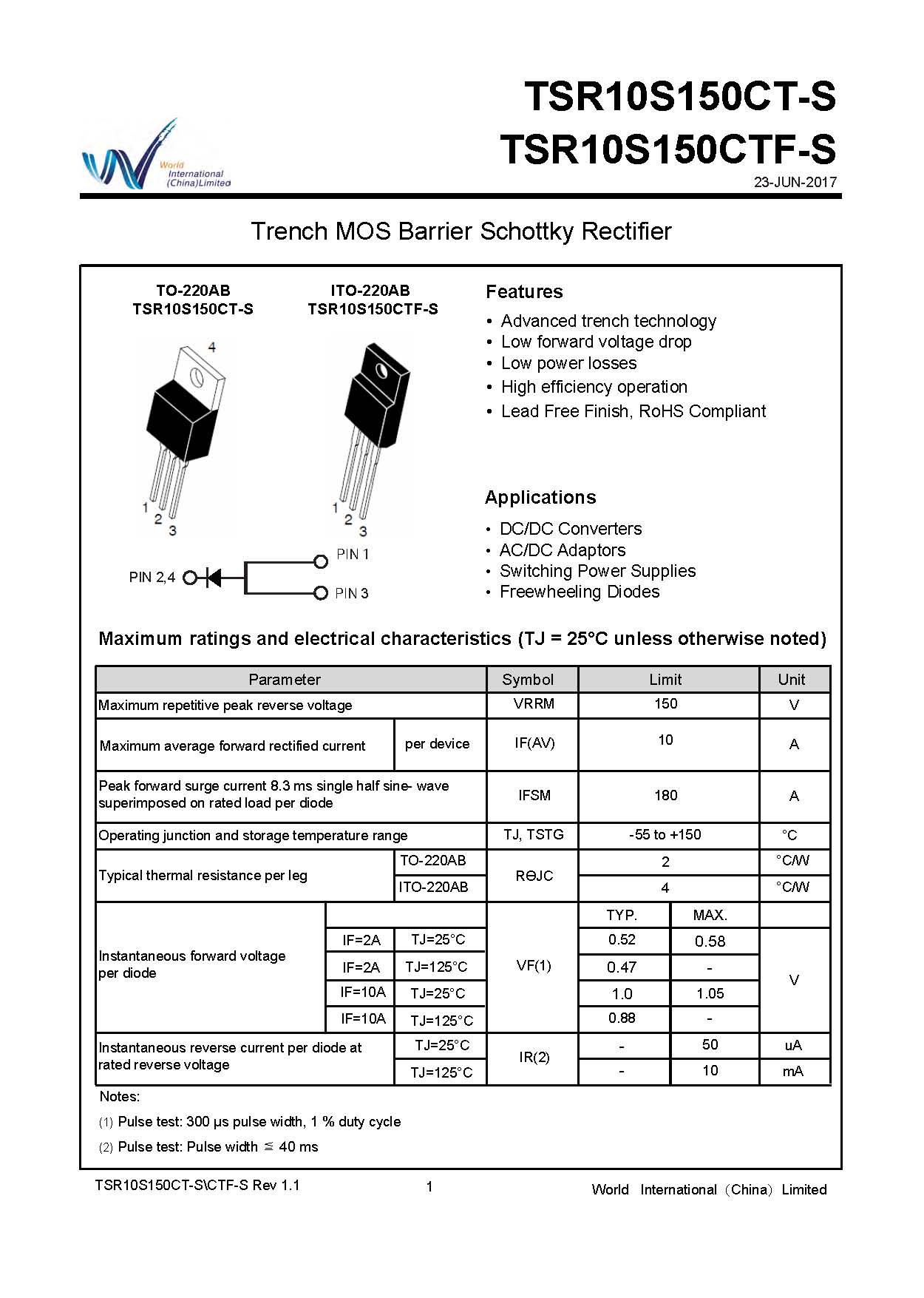 沃尔德 TSR10S150CT 肖特基整流器 热销中