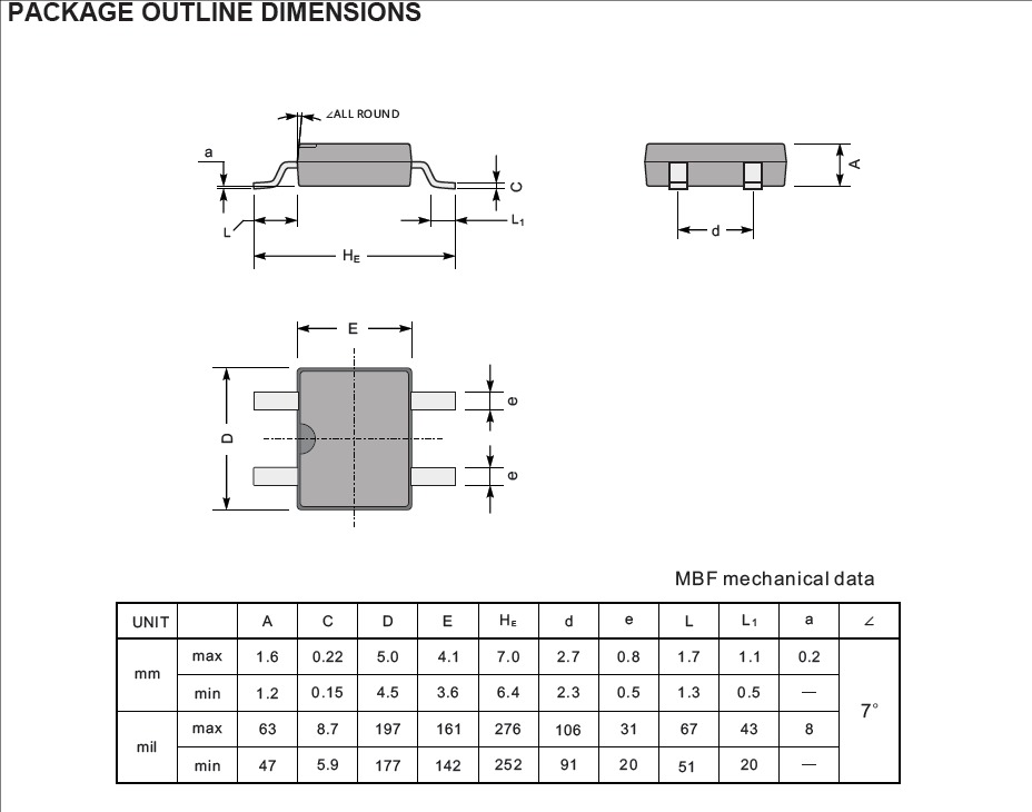 ● 外壳:肖特基势垒芯片上的MBF模制塑料体