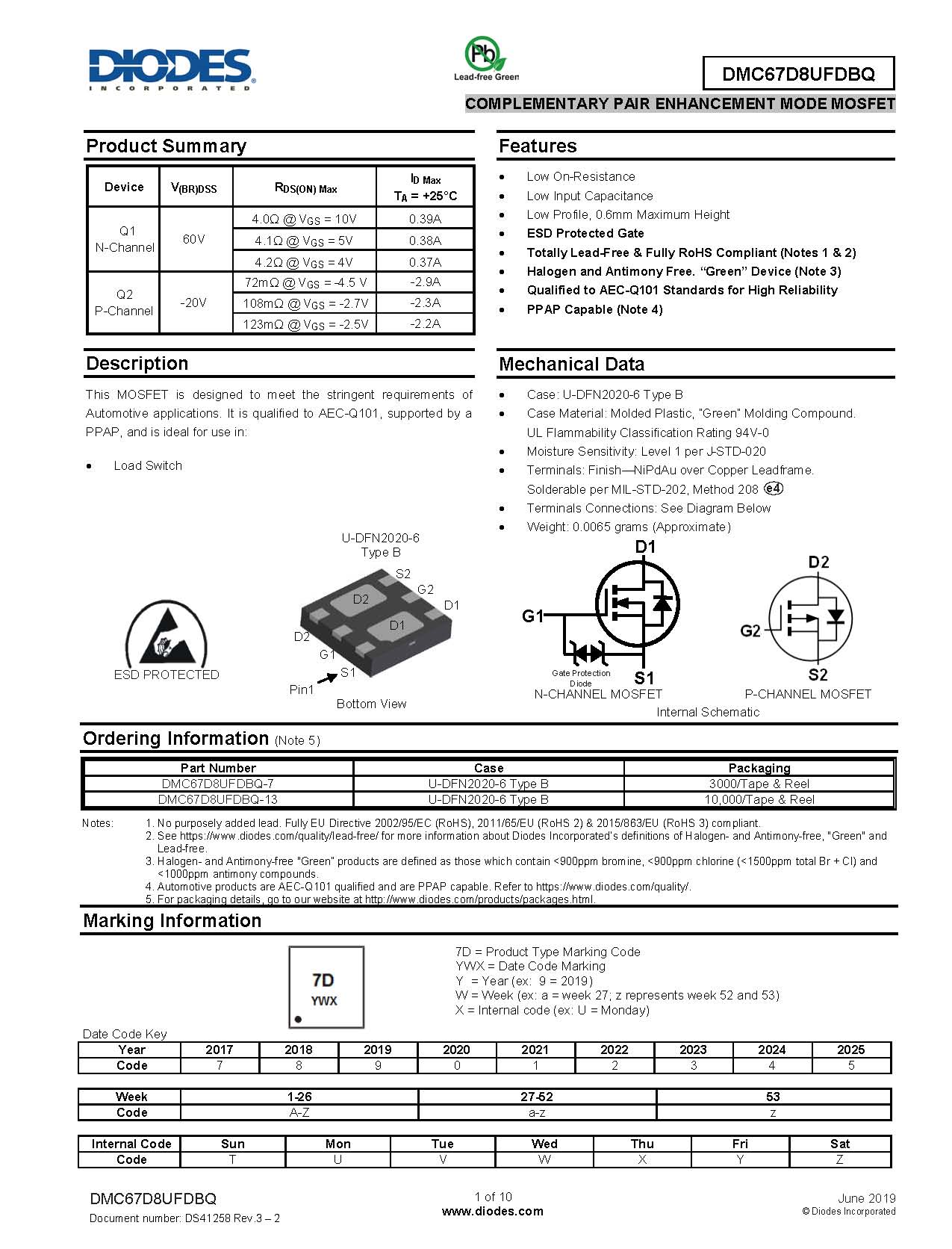 DIODES达尔MOS管 DMC67D8UFDBQ-7 互补对增强型