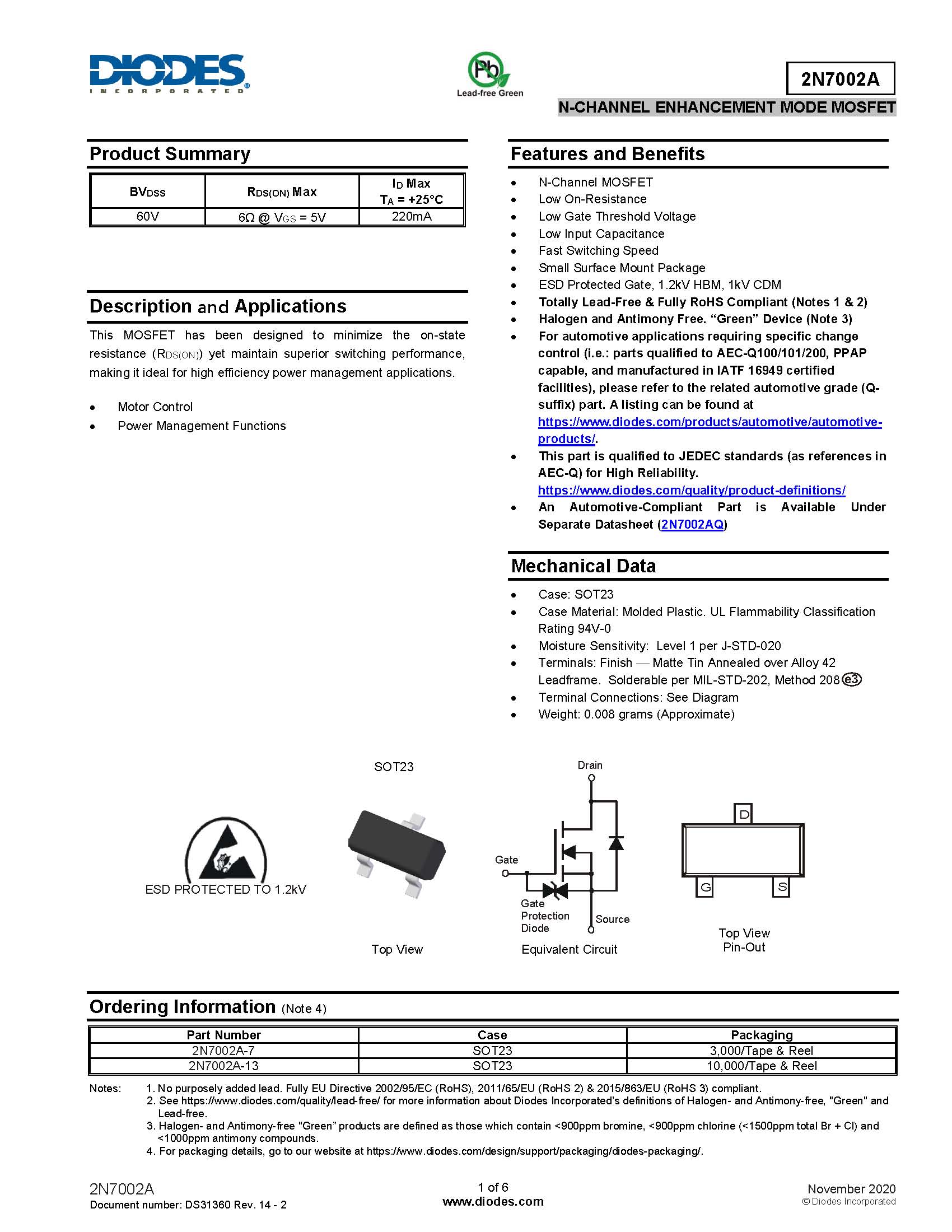 达尔N沟道MOS管 2N7002A-7 采用SOT23封装