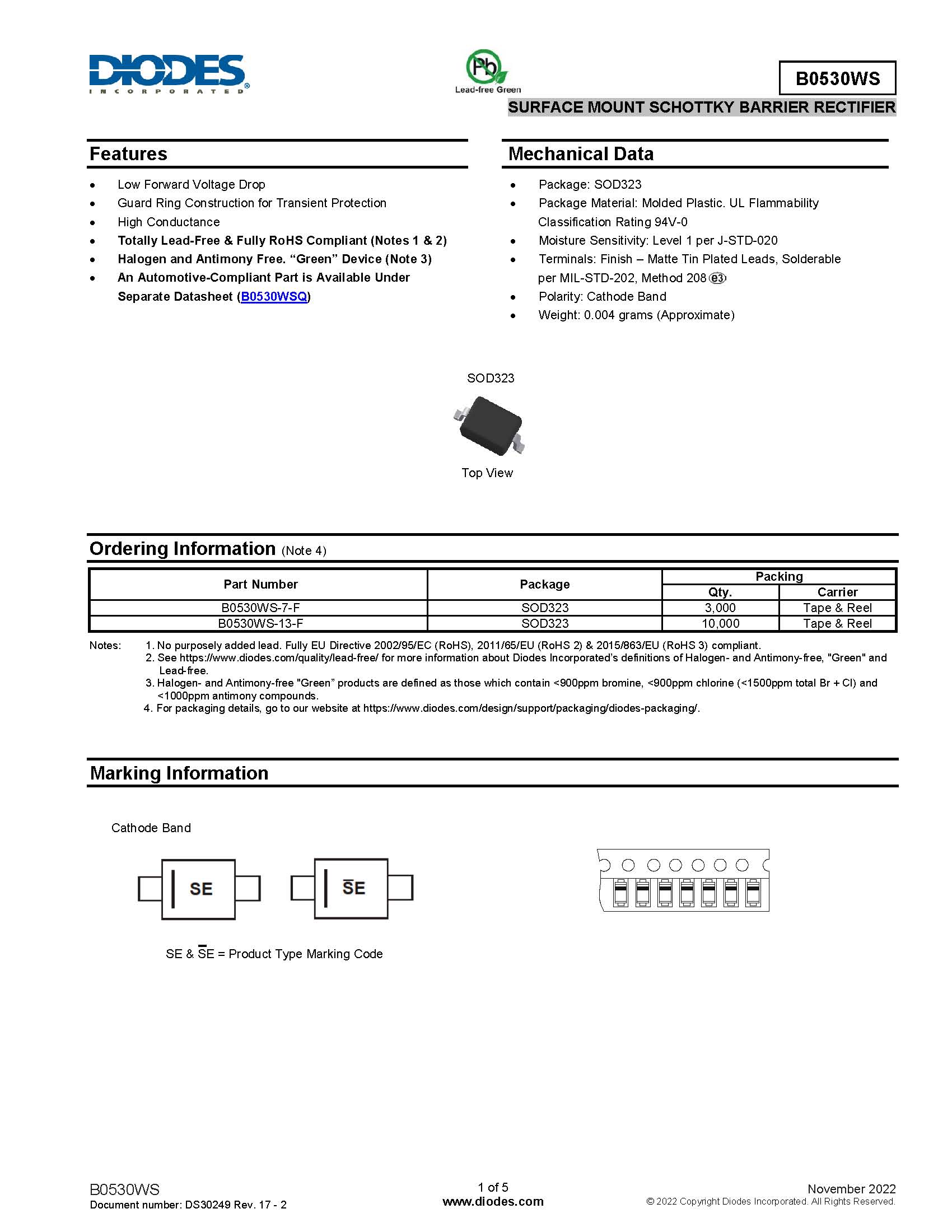 热销中 DIODES达尔 B0530WS-7-F 肖特基势垒二极管
