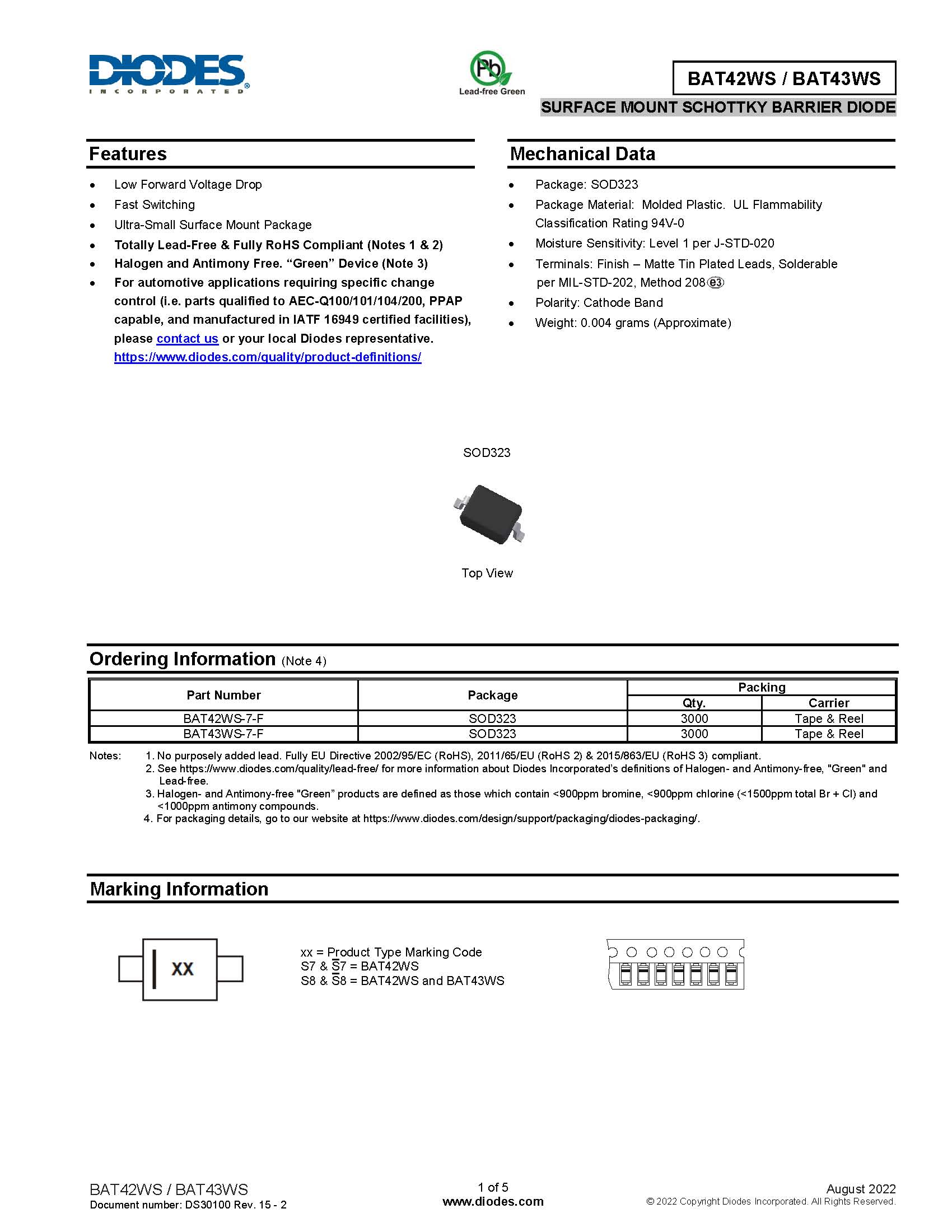 达尔 BAT42WS-7-F 肖特基势垒整流器 SOD323封装